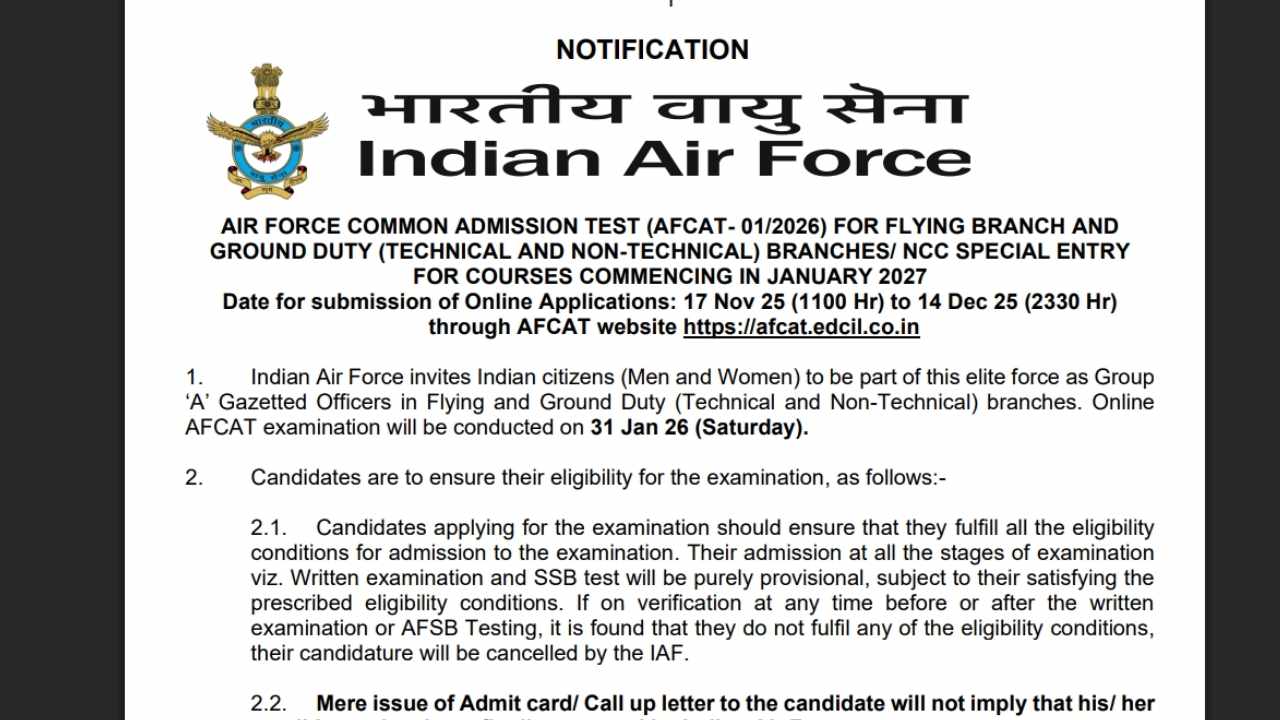 Indian Air Force AFCAT 01/2026 Notification Out – 340 Posts के लिए Apply Online शुरू, जानें पूरी जानकारी